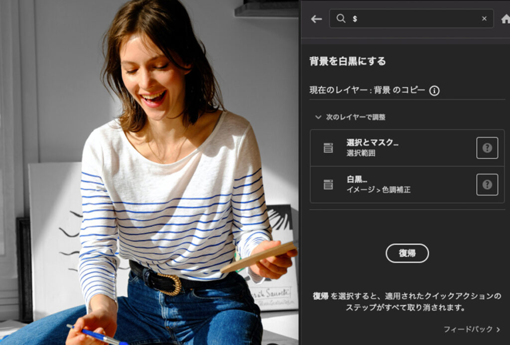 フォトショップのAI機能の中でも特筆すべきは「クイックアクション」です。