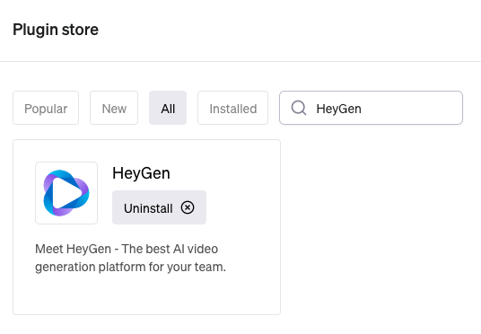 (1)ChatGPTのPlugin Storeで「HeyGen」と検索してください