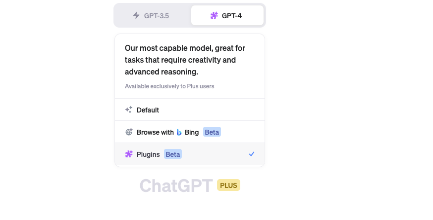 (2)ChatGPTの「GPT-4」を選び、Plugin Betaを選びます