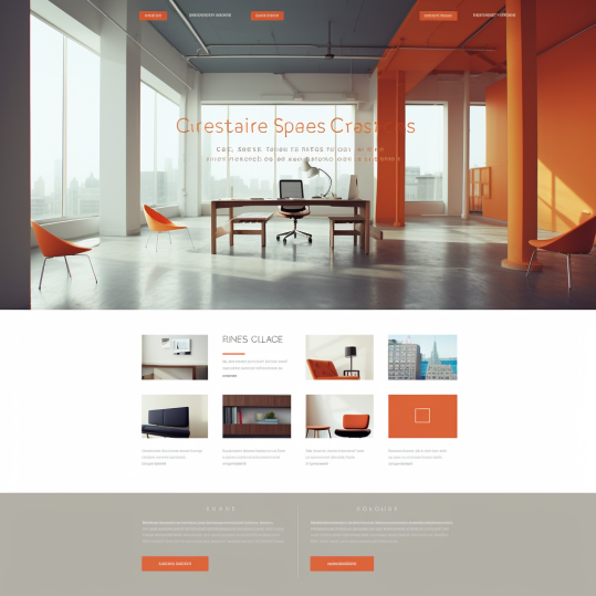 website design,title”Creative space designs business”, color palette”Modern and sophisticated shades”, font”sans serif”, image upper part”simple header image”, image beneath”emphasis on clean and minimal design”, layout header”Placed at the top to create a professional and clean office space, incorporating part of the interior as a design”, navigation”Clean style, use white text”, main content”Office design track record and portfolio, service details, customer success stories, contact form”, colt action”Placing it in a prominent position, with white text and a prominent text background”, footer”Displayed at the bottom of the page, light gray background, including copyright notice”, allow margins for image and text placement to achieve legibility and visual balance, Incorporate interactive elements to increase user engagement
