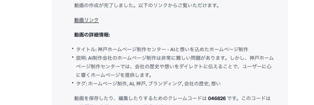 動画のリンクがはられていますね。「クレームコード」は、動画を編集するときに使用します。では、どんな動画ができたのかをみてみましょう。