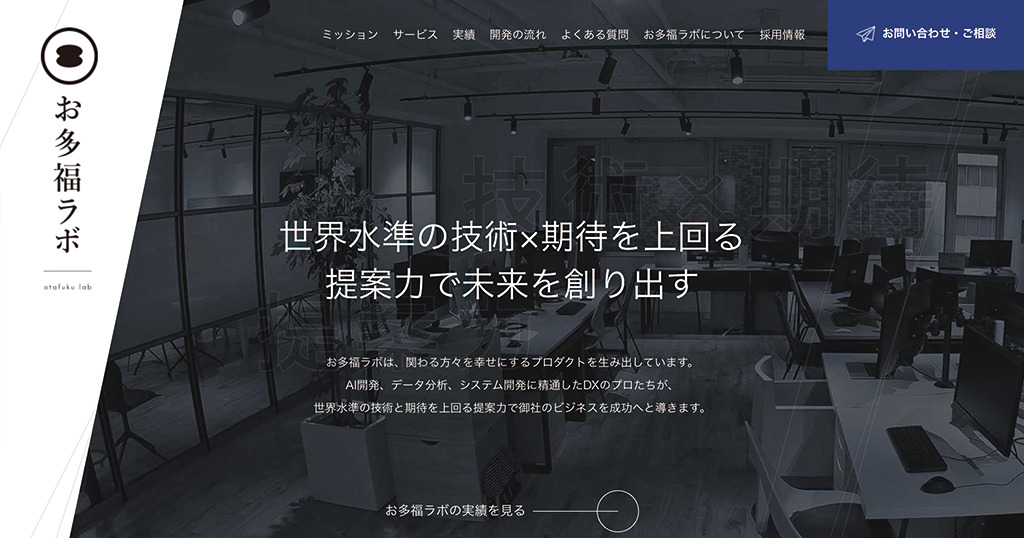 お多福lab 様 IT・サービス コーポレートサイト 世界水準の技術×期待を上回る 提案力で未来を創り出すお多福ラボは、関わる方々を幸せにするプロダクトを生み出しています。 AI開発、データ分析、システム開発に精通したDXのプロたちが、世界水準の技術と期待を上回る提案力で御社のビジネスを成功へと導きます。お客様株式会社お多福lab 様URLhttps://otafuku-lab.co/業種・業界IT・サービス事業内容AI・システム開発サイト種別コーポレートサイト担当領域CMS構築 / コーディング / サイト設計 / デザイン / ライティング制作期間3ヶ月エリア大阪府大阪市西区最寄駅大阪メトロ「肥後橋」駅