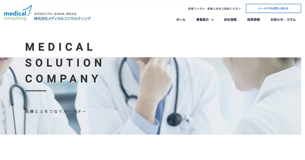 メディカルコンサルティング 様 医療・福祉 コーポレートサイト 医療コンサルティングと医師・看護師の人材紹介メディカルコンサルティングは、医療機関が抱える課題を解決、支援していくコンサルティング会社です。医療機関における経営課題と医師・看護師の人材不足を解決できることを強みとしています。お客様株式会社メディカルコンサルティング 様URLhttps://m-con.co.jp/業種・業界医療・福祉事業内容経営コンサルタントサイト種別コーポレートサイト担当領域CMS構築 / コーディング / サイト設計 / デザイン / ライティング制作期間3ヶ月エリア兵庫県神戸市中央区最寄駅JR神戸線「三ノ宮」駅、各線「三宮」駅