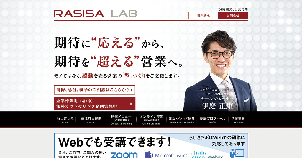 らしさラボ 様 IT・サービス コーポレートサイト 営業力向上、ソーシャルスタイル研修、コーピング研修期待に応えるから、期待を超える営業へ。モノではなく、感動をうる営業の「型」づくりをご支援します。お客様株式会社 らしさラボ 様URLhttps://www.rasisalab.com/業種・業界IT・サービス事業内容オーダーメイド型企業研修の開発、実施サイト種別コーポレートサイト担当領域CMS構築 / コーディング / サイト設計 / デザイン / ライティング制作期間3ヶ月エリア京都府京都市西京区最寄駅各線「京都」駅