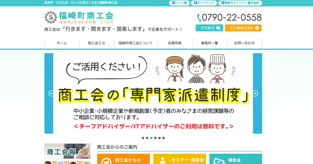 福崎町商工会 様 IT・サービス コーポレートサイト 商工会は「行きます・聞きます・提案します」で企業をサポート!福崎町商工会は、昭和35年に設立されて以来、総合経済団体として地域商工業の発展に寄与して参りました。 また、特産品開発事業にも力を入れ福崎町と共に『もちむぎ麺』の開発を行い、民俗学の父「柳田國男」などの地域資源とともに全国的にPRを行っています。お客様福崎町商工会 様URLhttps://www.fukusaki.or.jp/業種・業界IT・サービス事業内容商工会サイト種別コーポレートサイト担当領域コーディング / サイト設計 / デザイン / ライティング制作期間3ヶ月エリア兵庫県神崎郡福崎町最寄駅JR播但線「福崎」駅