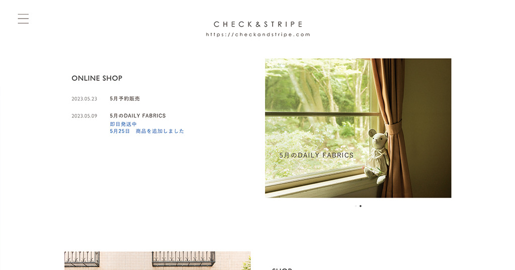 CHECK&STRIPE 様 小売・販売 コーポレートサイト シンプルで質のよいもの・・・どこにでもありそうだけどないもの・・・オリジナルの布(リネンやコットンなど)、リバティプリント、パターン、雑貨などを販売。お客様株式会社ラブロ 様URLhttps://checkandstripe.com/業種・業界小売・販売事業内容布や雑貨の販売サイト種別コーポレートサイト担当領域CMS構築 / コーディング / サイト設計 / デザイン制作期間6ヶ月エリア兵庫県芦屋市最寄駅JR神戸線「芦屋」駅