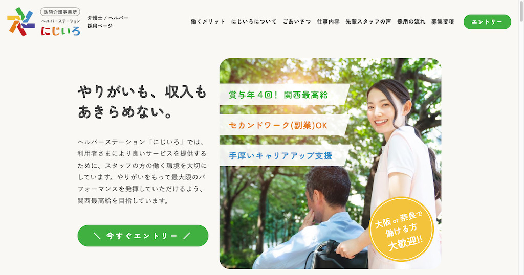 ヘルパーステーション「にじいろ」では、利用者さまにより良いサービスを提供するために、スタッフの方の働く環境を大切にしています。やりがいをもって最大限のパフォーマンスを発揮していただけるよう、地域最高給を目指しています。